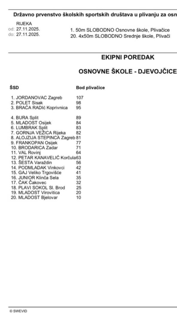 U Rijeci na bazenima Kantrida (26. i 27. studenoga) održalo se državno natjecanje u plivanju. Sudjelovalo je 20 ekipa diljem lijepe naše te su naše cure osvojile izvrsno 6.mjesto!!