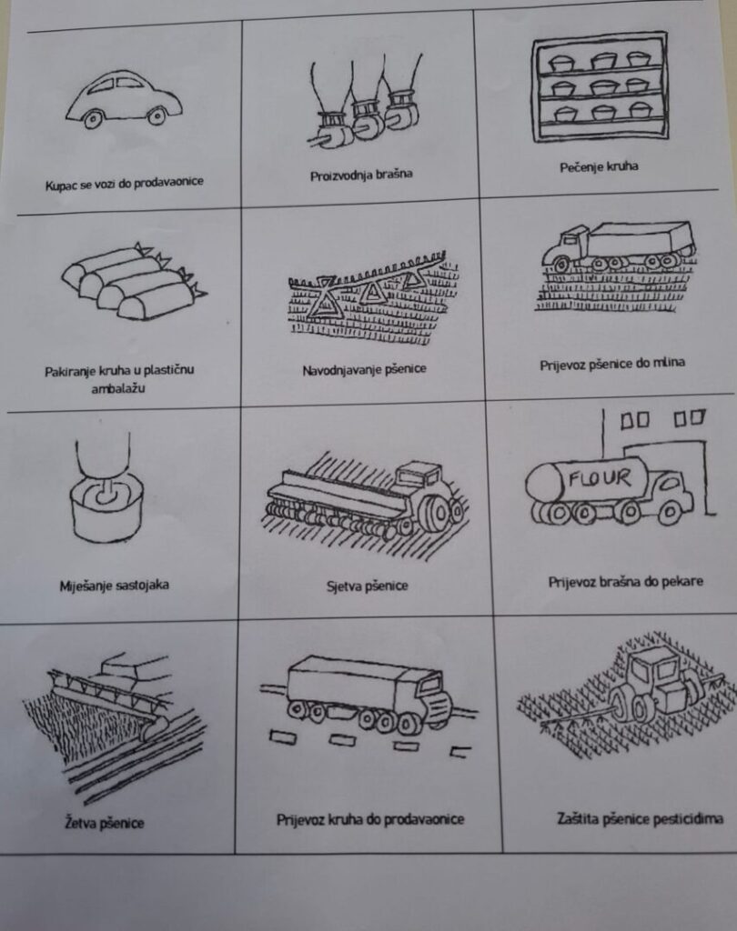 Učenici su u grupnom radu dobili zadatak da kroz kreativan rad izrade životni put naprimjer kruha, pamučne majice, mobitela s naglaskom na svaki dio procesa u kojem se koristi gorivo te time stvara ugljikov dioksid i utječe na globalno zatopljenje.