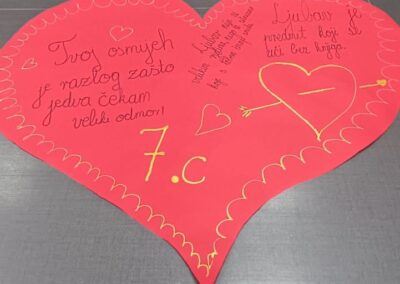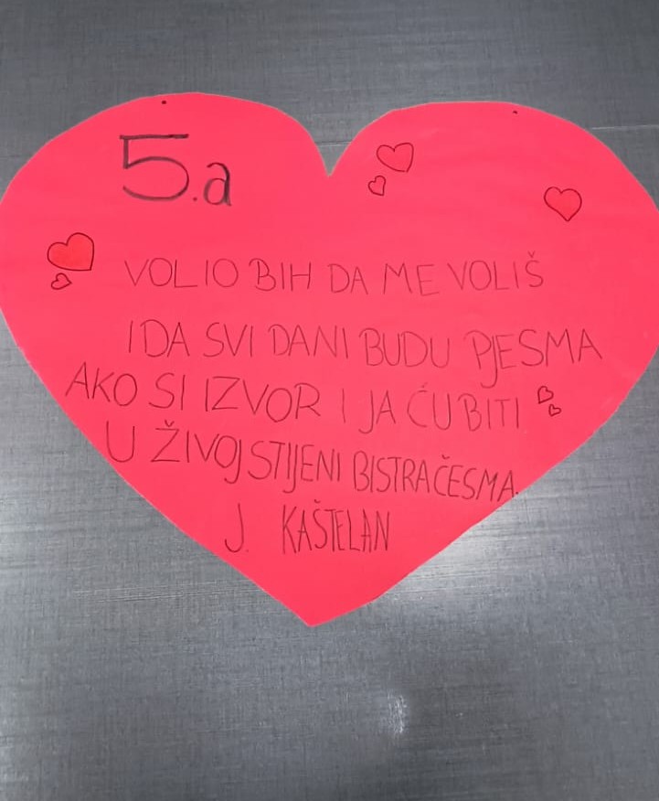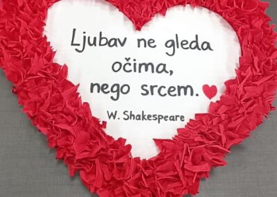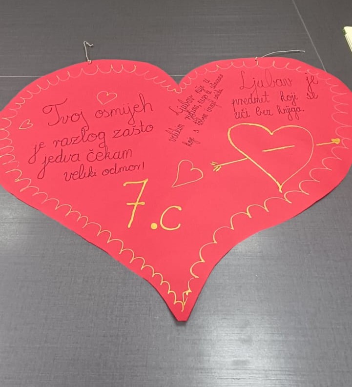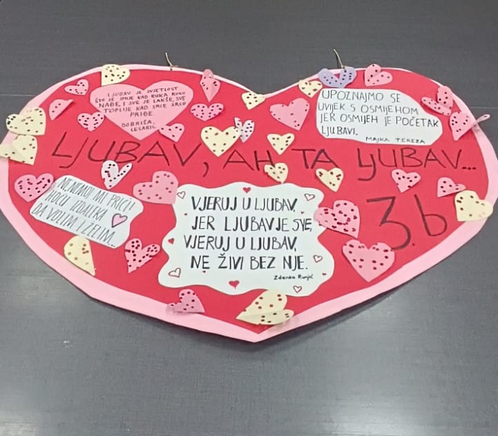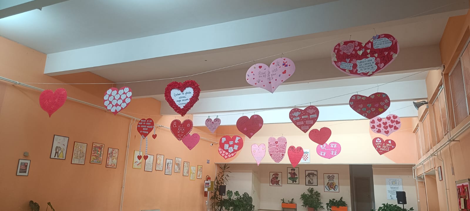 Veljača, jedini ženski mjesec u godini, donijela je puno nježnosti u našu školu. Ne želeći da ljubavi, toj božanskoj pokretačkoj sili, posvetimo samo jedan dan, odlučili smo proširiti njene plodove tijekom cijelog ovog mjeseca. Srca, ružičasta i crvena, ispisana romantičnim, prijateljskim i toplim porukama krasila su atrij naše škole. Svi razredi su sudjelovali te smo ih zajedničkim snagama osovili na užad kako bismo iznad naših glava dobili ružičasto nebo puno ljubavi. Na samo Valentinovo ta lebdeća srca bila su scenografija za recitiranje i pjevanje najpoznatijih ljubavnih pjesama. A ružičaste su bile i majice kojima smo obilježili Dan borbe protiv vršnjačkog nasilja. Naša psihologinja Vesna tim je povodom održala petašima i njihovim roditeljima prezentaciju o nenasilnom rješavanju sukoba. Djeca su i tu, kao i uvijek, imala kreativne ideje kako sukob pretvoriti u suradnju. Tim aktivnostima pridružili su se i naši najmlađi, prvaši, zajedno sa svojom učiteljicom Natašom. Veselo je bilo i na pokladni utorak, pogotovo u malim razredima gdje su se, osim kostimiranih učenika, od kraja dale i njihove učiteljice. Pun mjesec događanja u školi, a sve to možete vidjeti i u maloj galeriji slika ispod teksta. Na kraju, završavam s filmskom mišlju da love, actually, is all around. Samo treba otvoriti malo oči, naćuliti uši i pružiti ruku na dar.